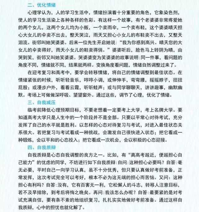 另一方面,家長也要注意避免詢問考生“考得怎么樣”等與考試相關的話題。上午或者下午考試結束后,考生不要劇烈運動,有可能的話洗個澡放松,保持適當休息。