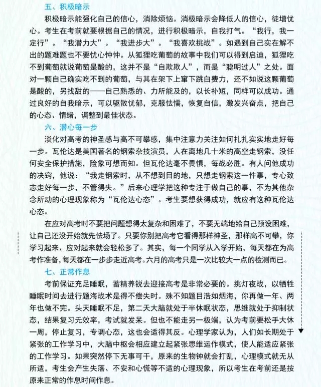 還有的考生,在剛開始做題時或者做題中途會越做越緊張、呼吸急促、心情壓抑,這時候建議考生閉上眼睛深呼吸,憋氣5~10秒鐘后再把胸中悶氣緩緩吐出;或者暫時停筆,看看考場外的花木、建筑等風景,轉換思維,在放松的同時積極暗示自己“我******不會出現(xiàn)任何意外”。